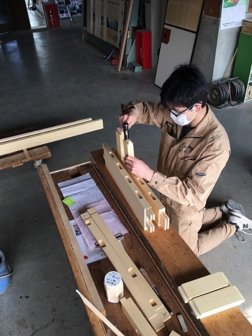 片側から、框が少し斜めになるようにほぞを入れていきます。